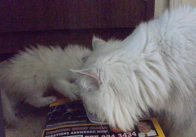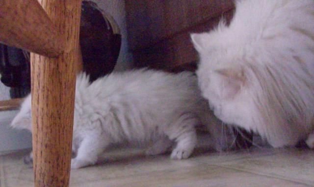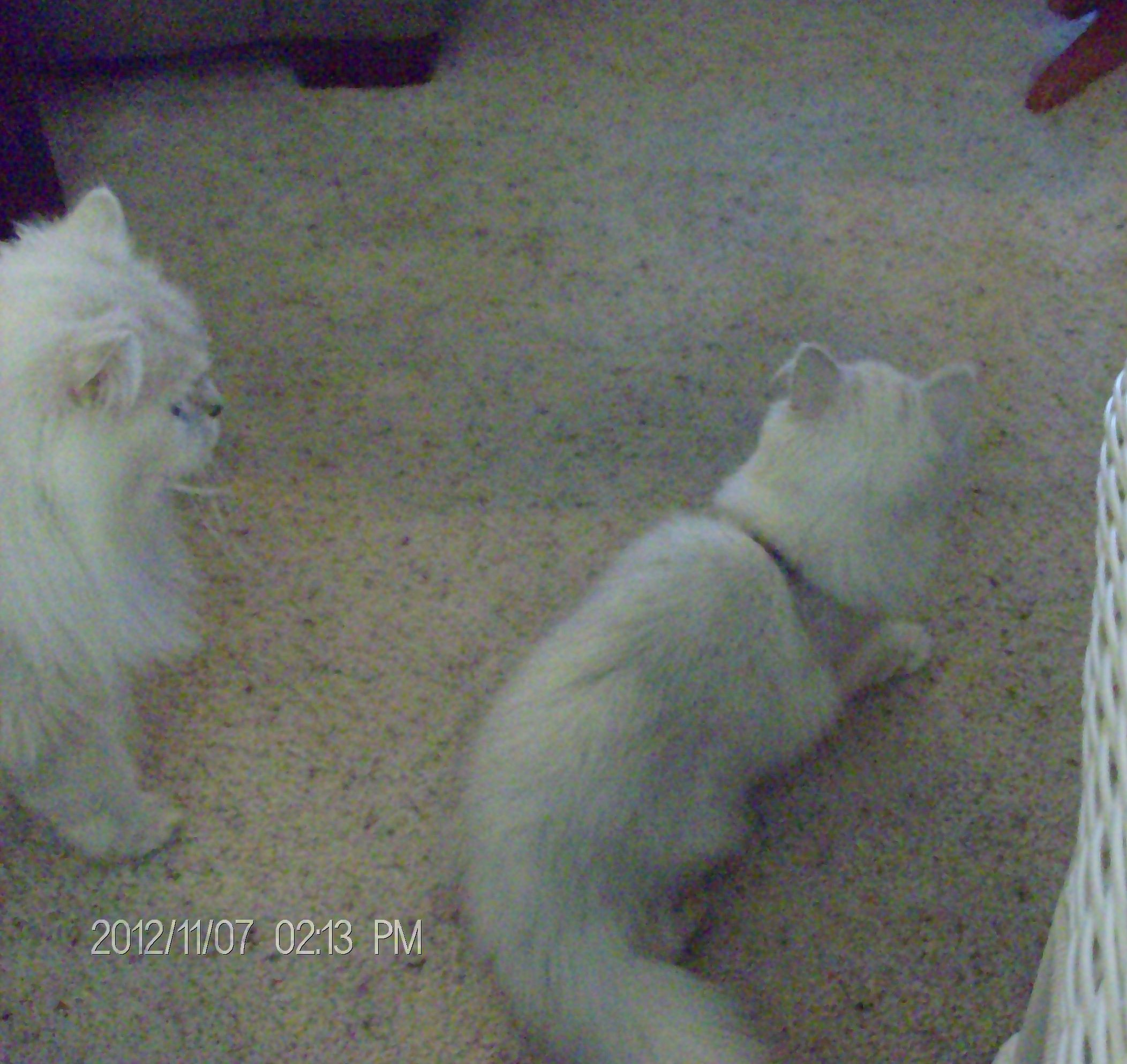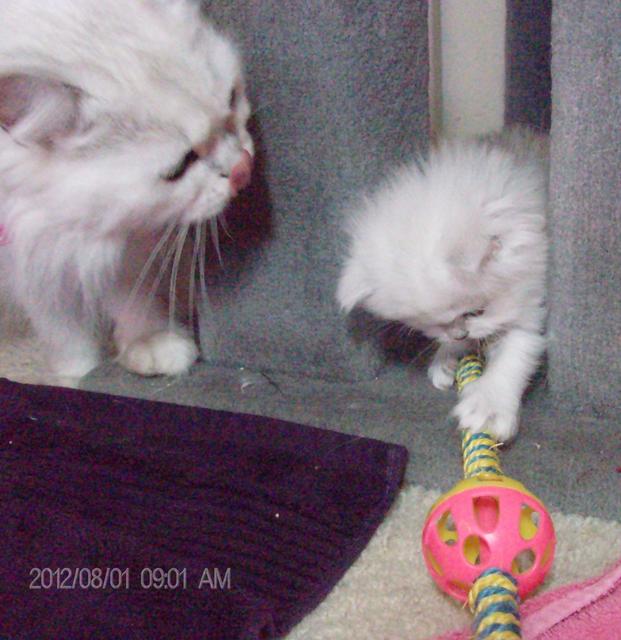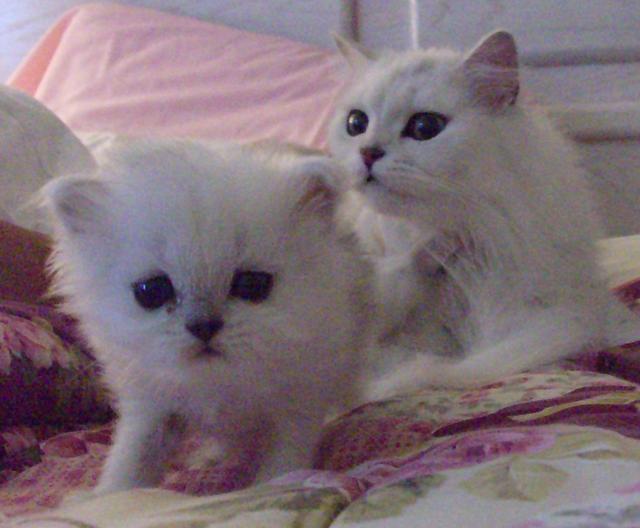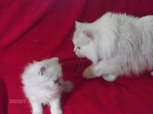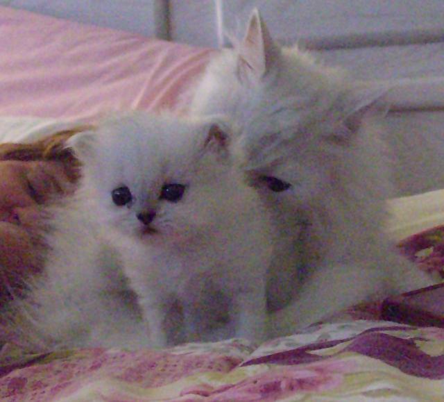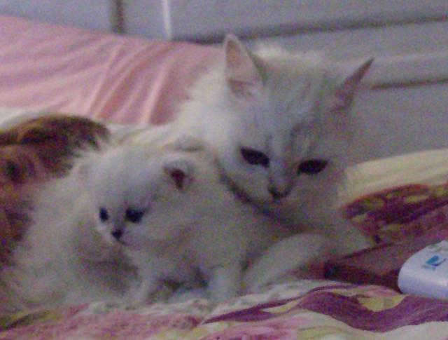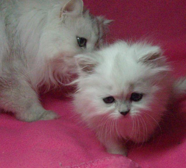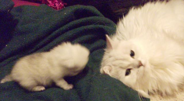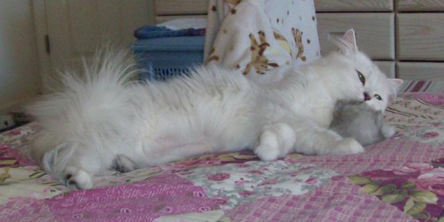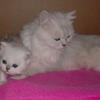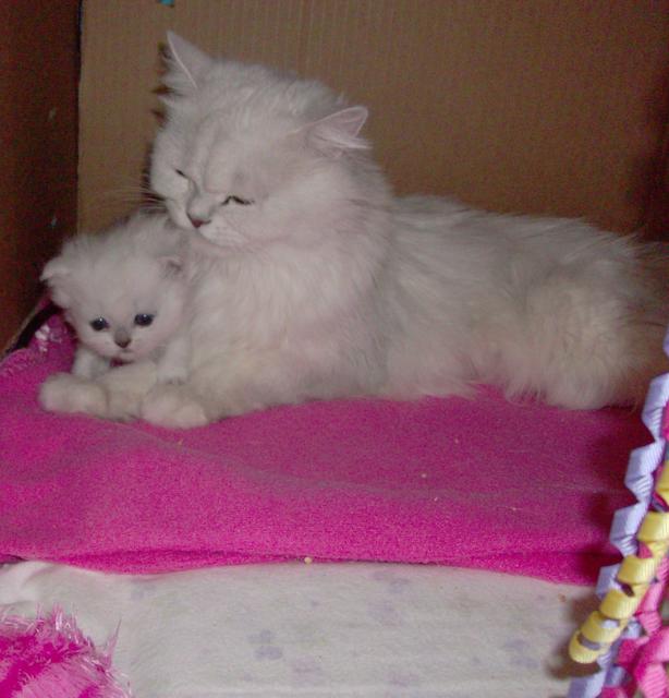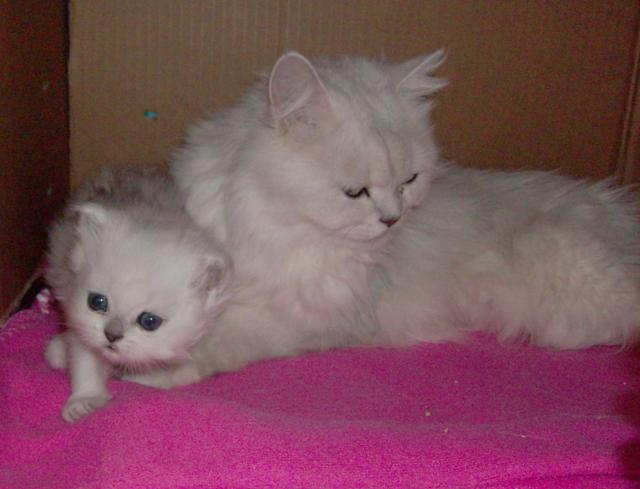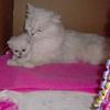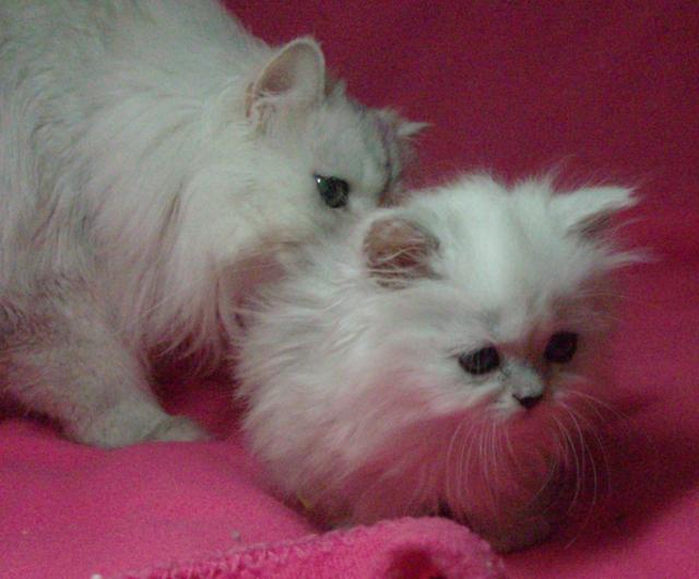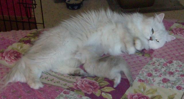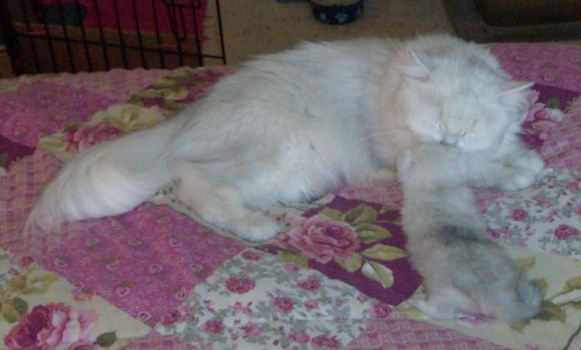Misty is on the right, Leilani is on the left. This is during summer shed which is why Leilani seems so thin; most of the persian hair has shed leaving the fine silky angora. Notice the look on Misty's face, she is done with being pregnant. This was taken at 40 days.