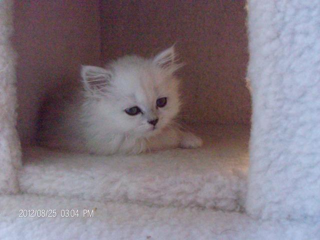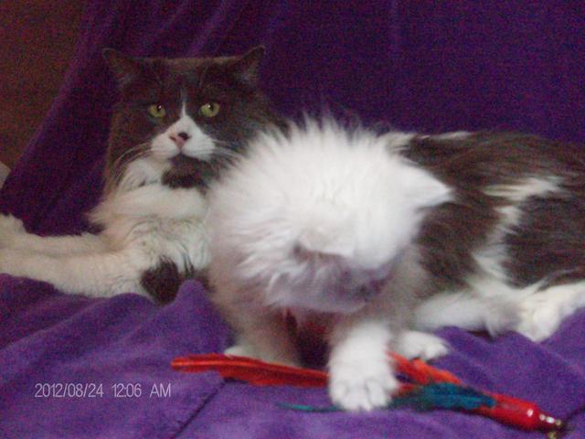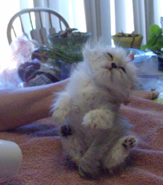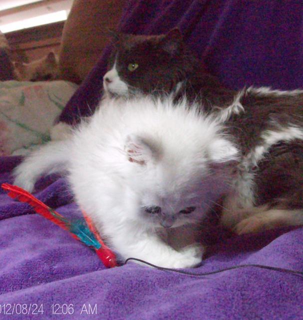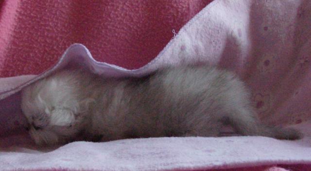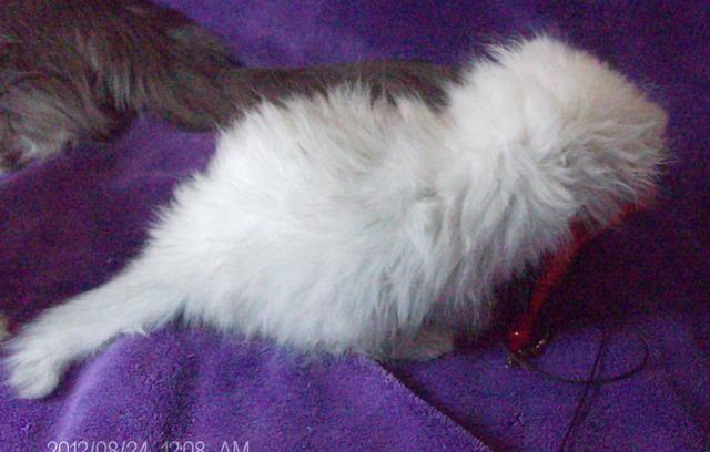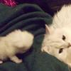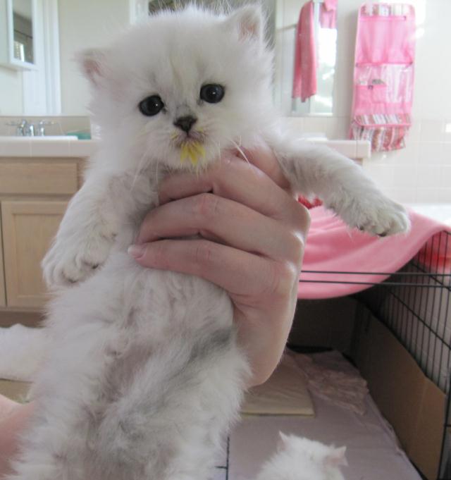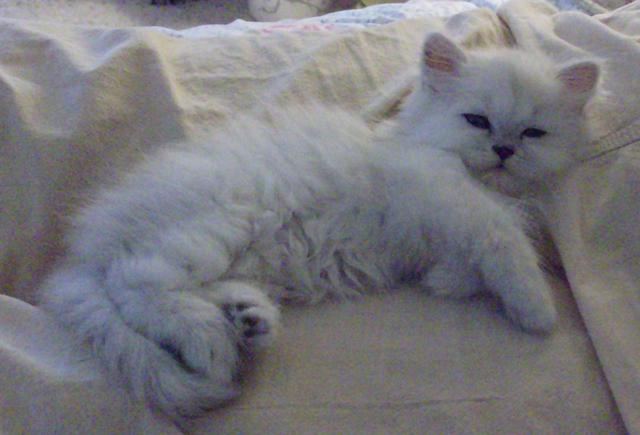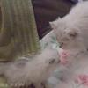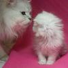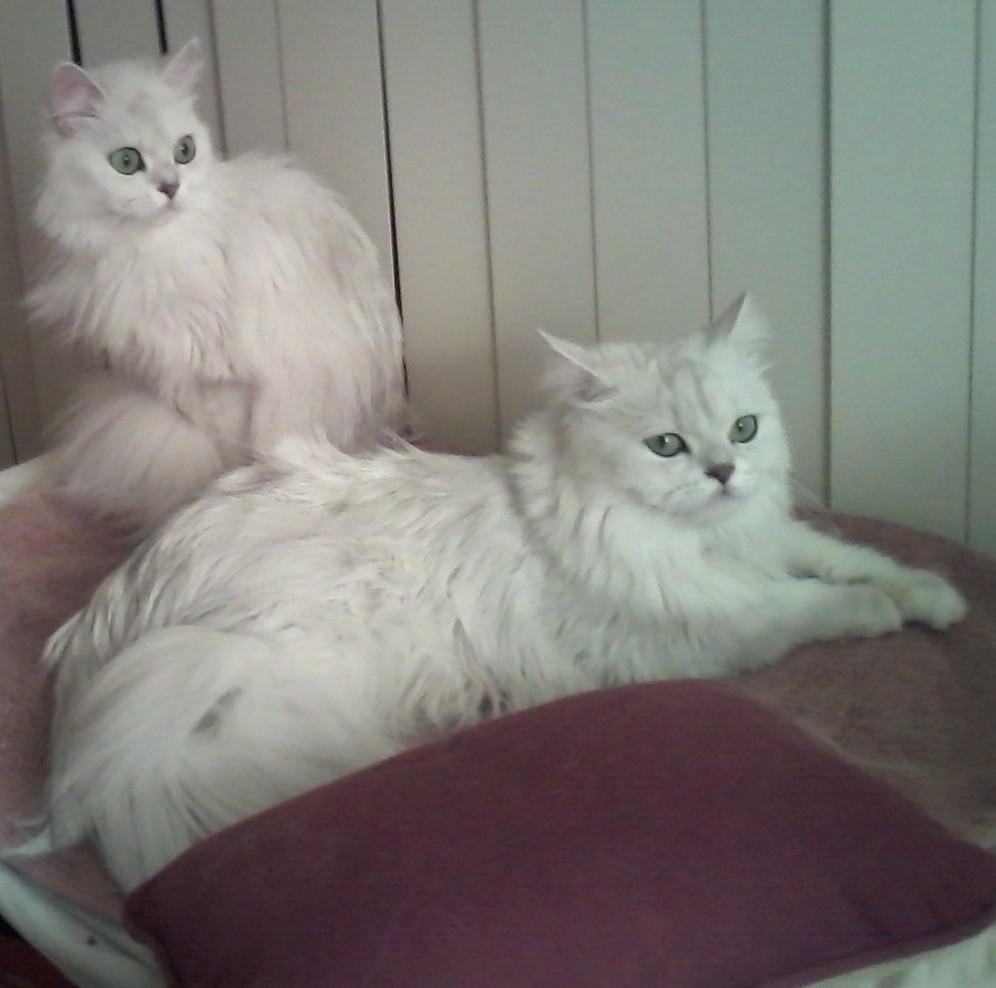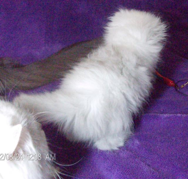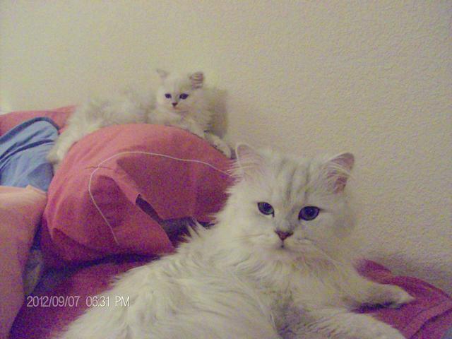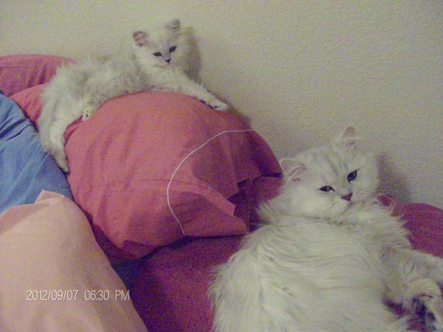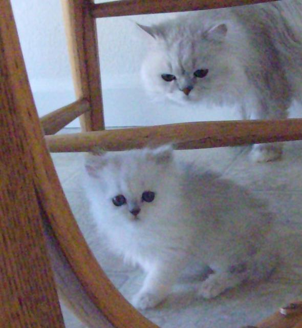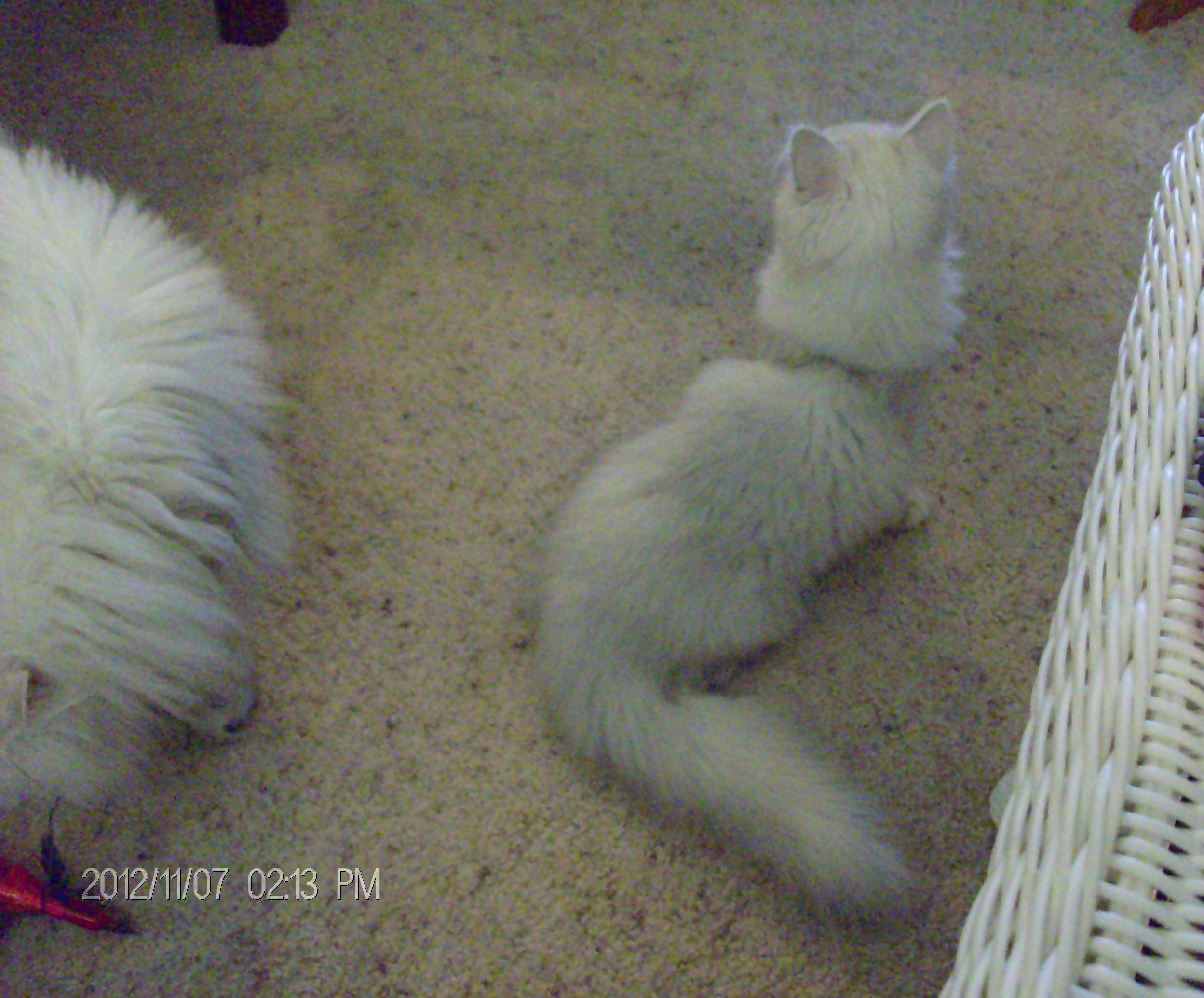 Misty is on the right, Leilani is on the left. This is during summer shed which is why Leilani seems so thin; most of the persian hair has shed leaving the fine silky angora. Notice the look on Misty's face, she is done with being pregnant. This was taken at 40 days.