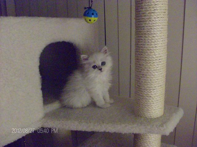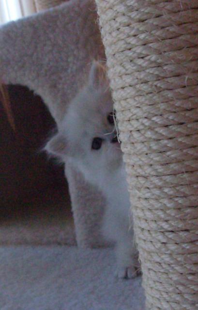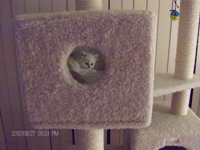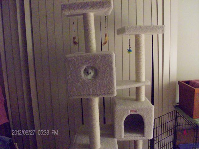 One day I heard mom yelling she'd lost Bella. I walked in & there she was inside the 3rd level box of the cat tower.
