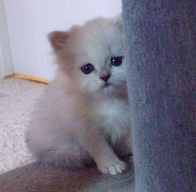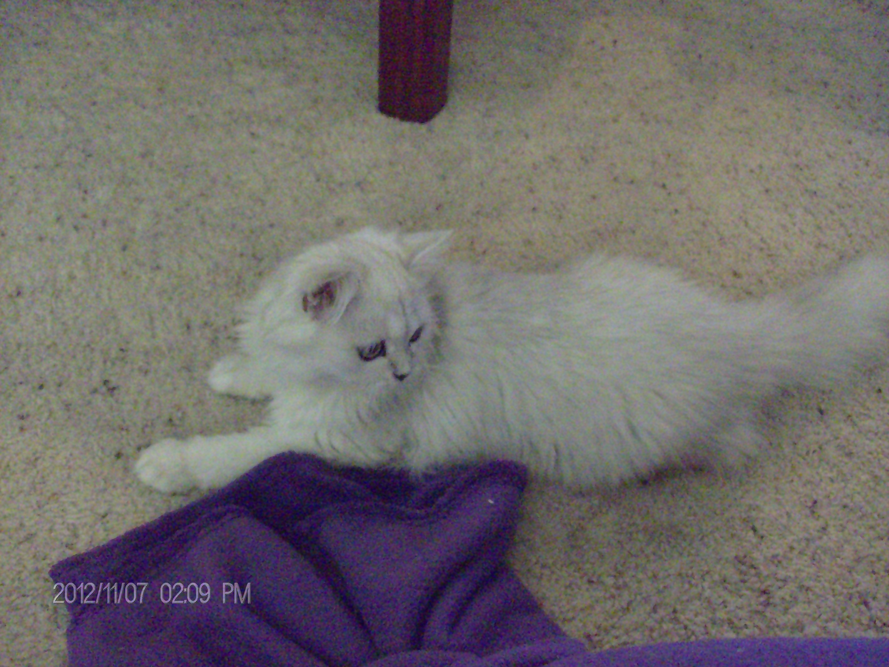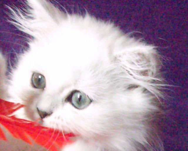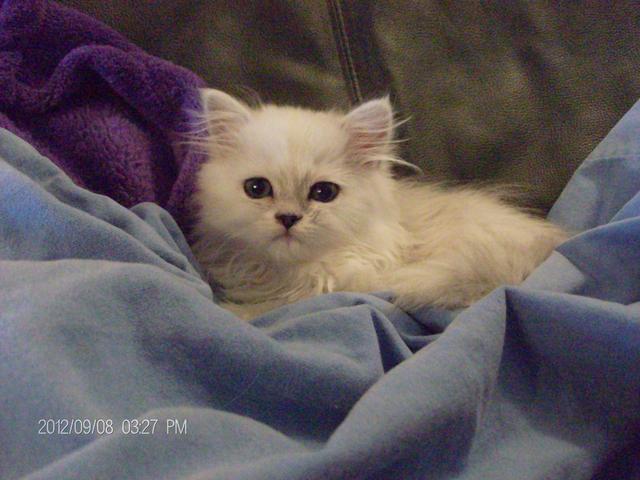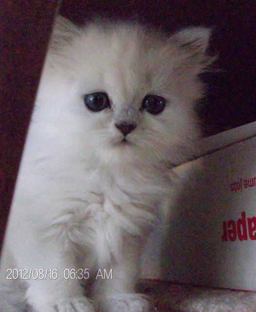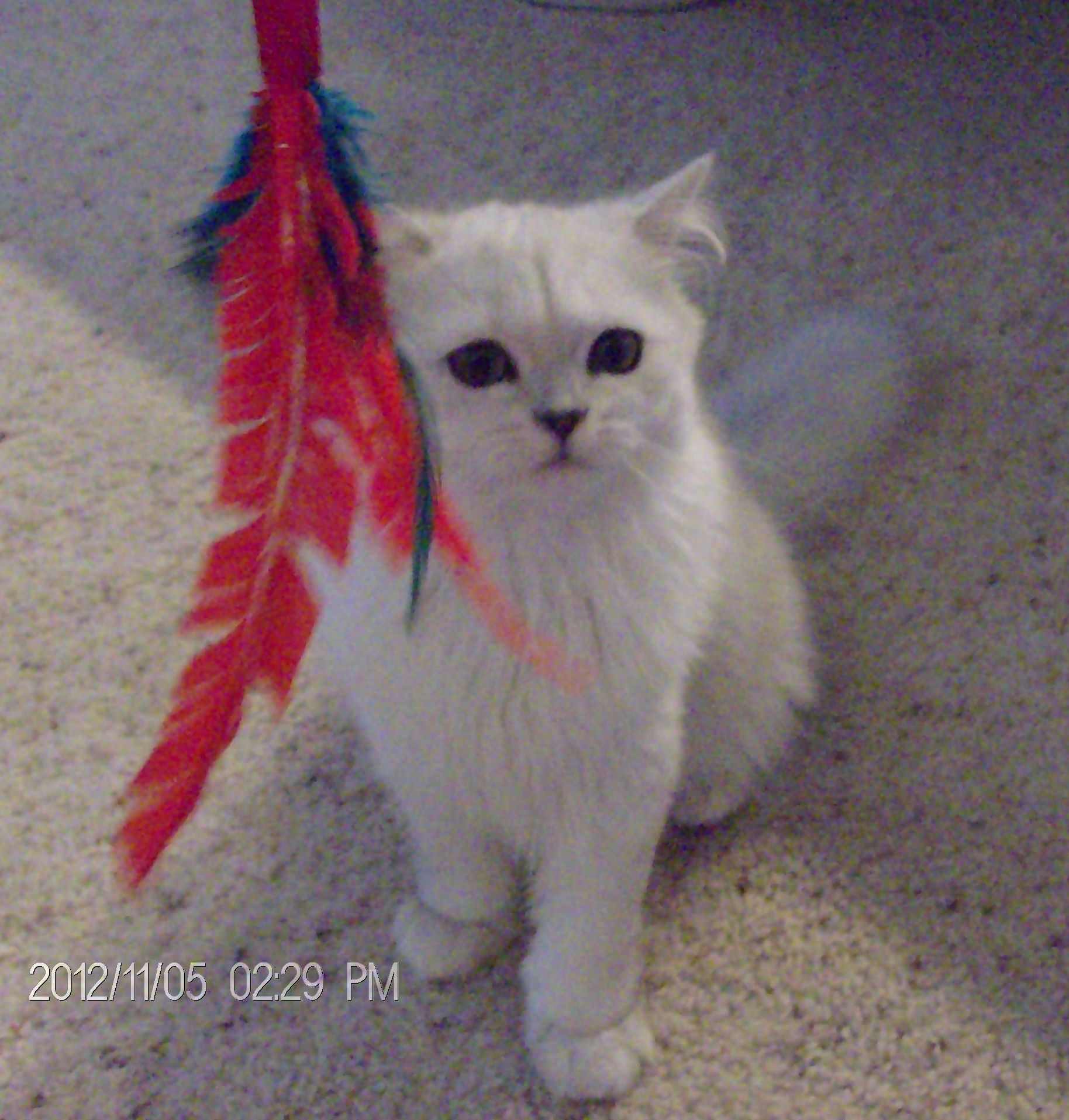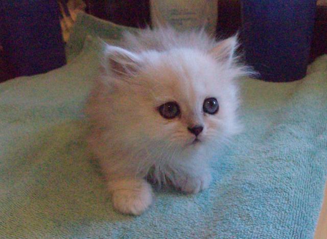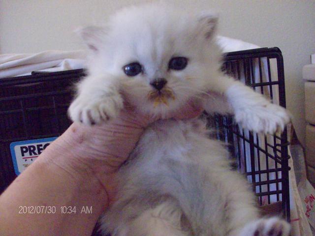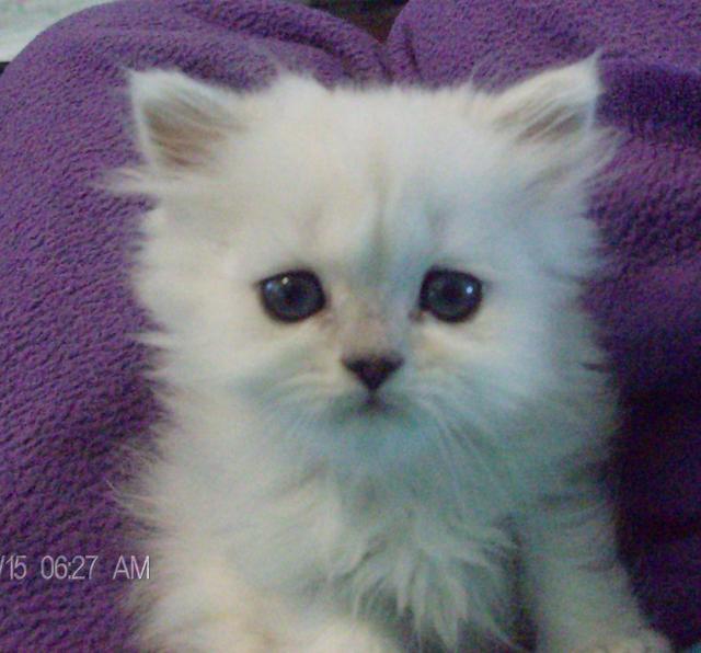 This picture was taken with a phone cam. I zoomed the eyes so you can see how they change to blue before an olive green to their permanent color at about 3 years old.
