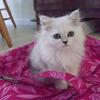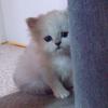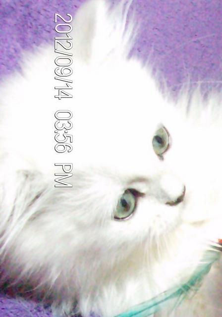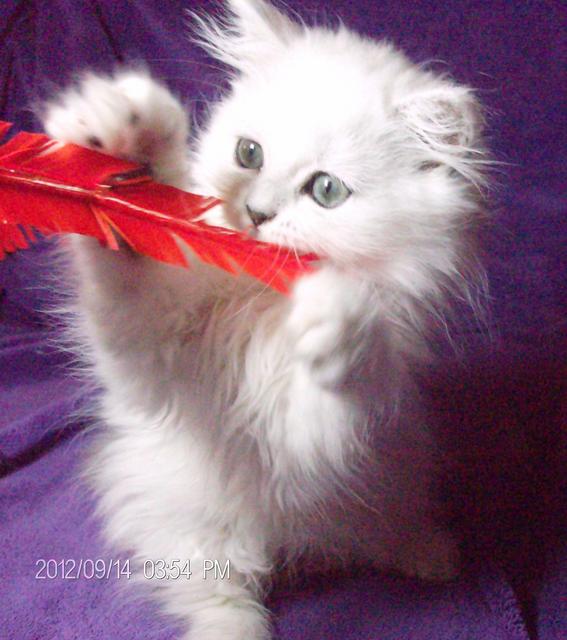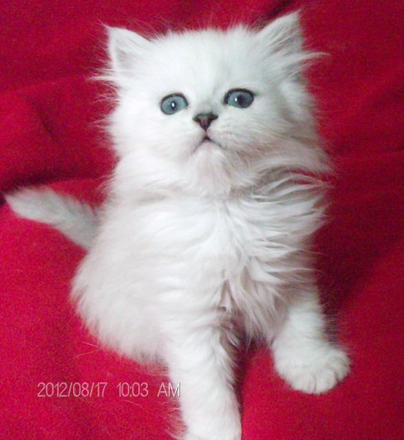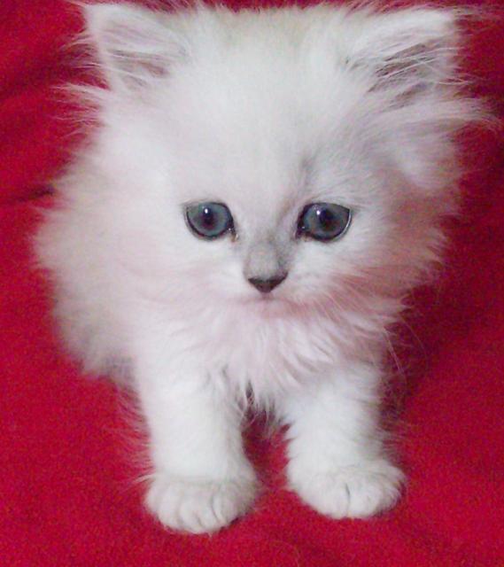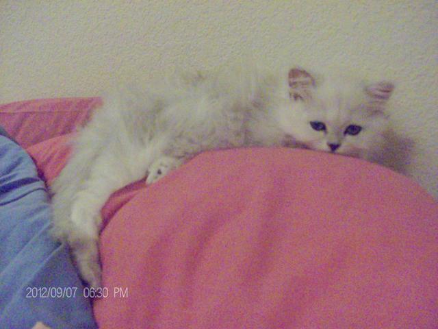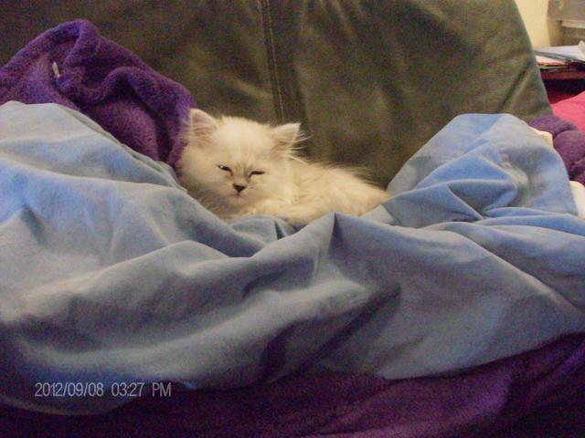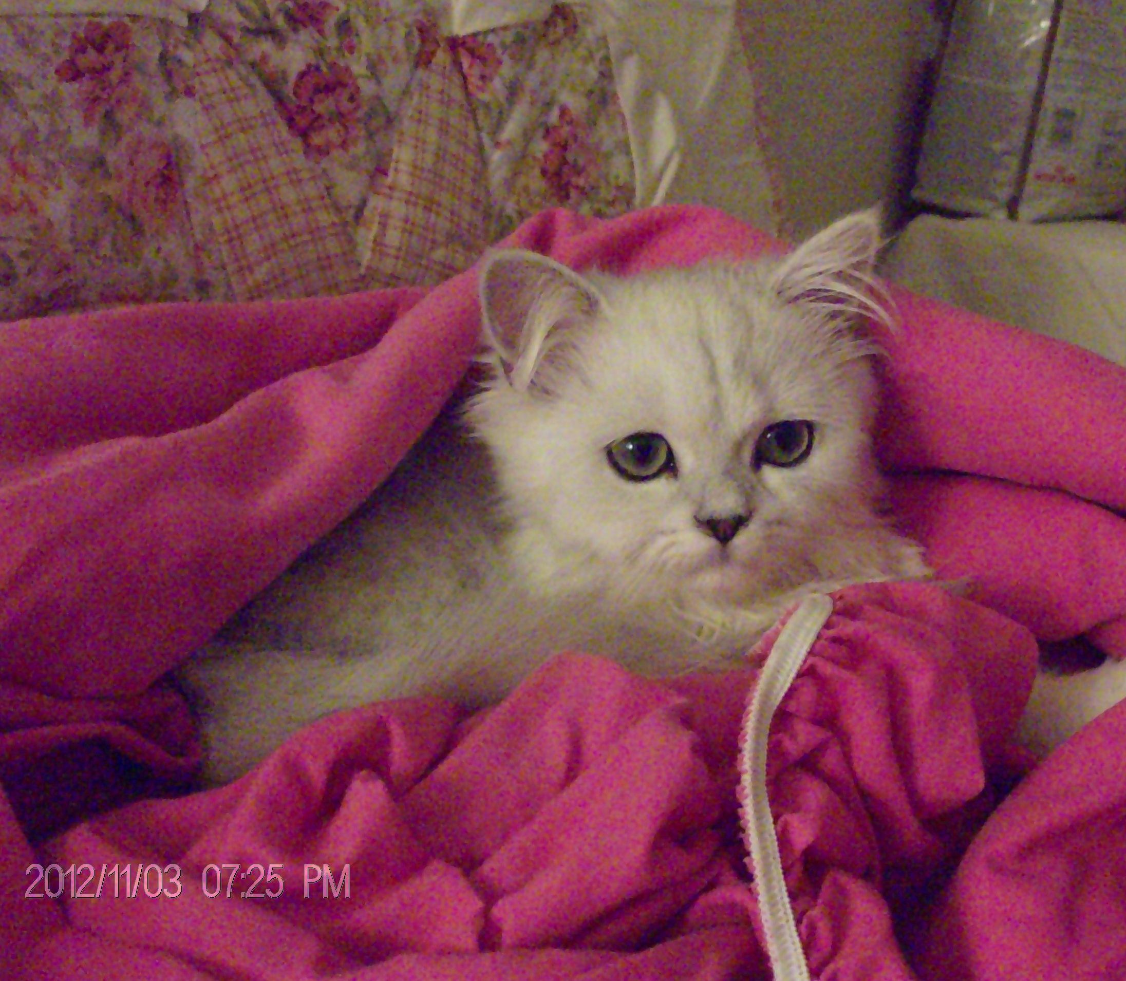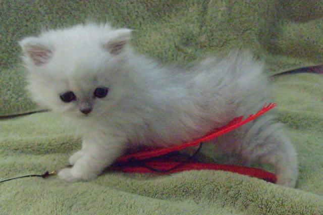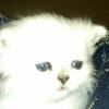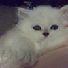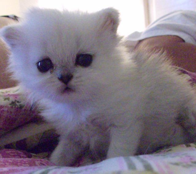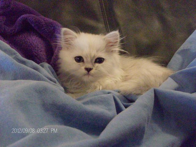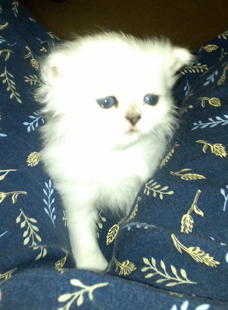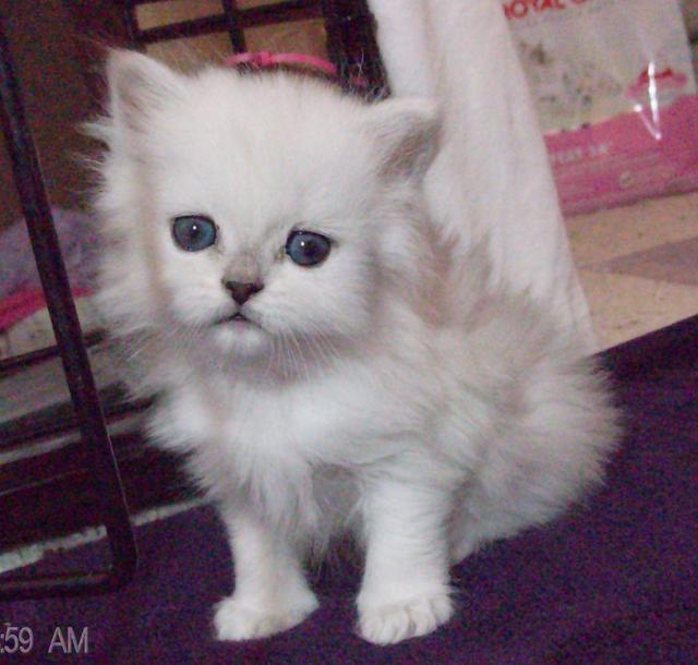 This picture was taken with a phone cam. I zoomed the eyes so you can see how they change to blue before an olive green to their permanent color at about 3 years old.