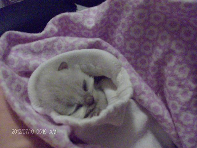 Here she is in a tennis sock. Since she was so small she needed to be kept warm. The first week was stressful.