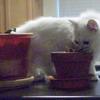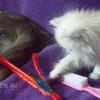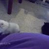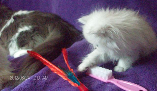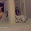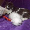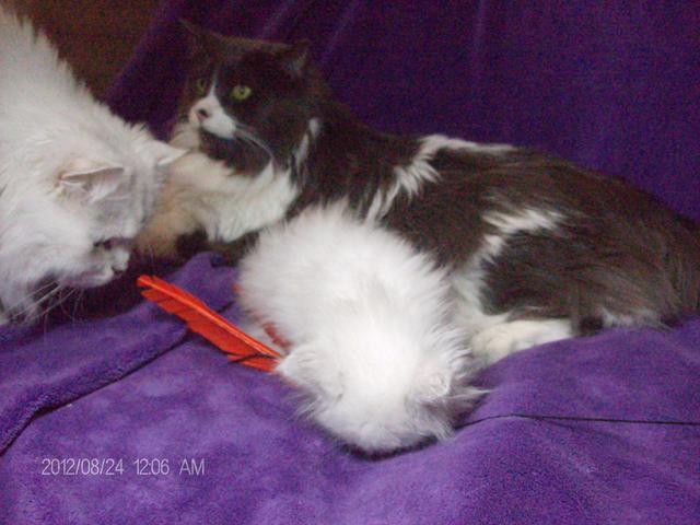 Lola is very social & unafraid. Here she is with Boycat. In the second you can see Papa Scooter looking on. In the third Benji comes in to play with her.