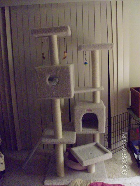 This is Bella playing on the 4th level box. We finally blocked above the 3rd level with books. I went in a couple of days later to see her up on the 5th level box & still don't know how she got up there. Sister Dusty was blocking her from getting up on the 6th level.